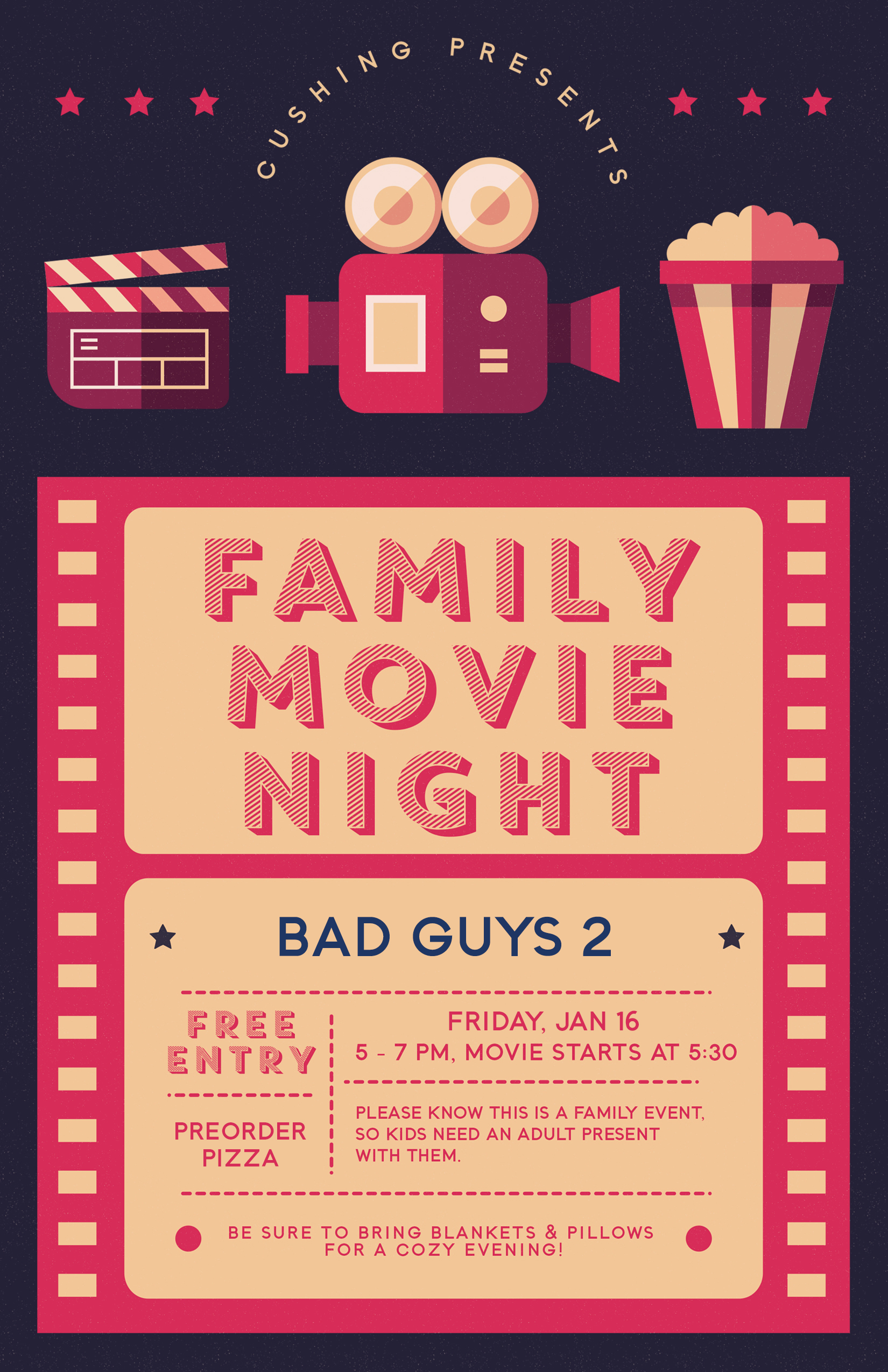 | Join us for the next Cushing Family Movie Night! Friday, January 16, 5 - 7p.m. (movie starts at 5:30 p.m.).
