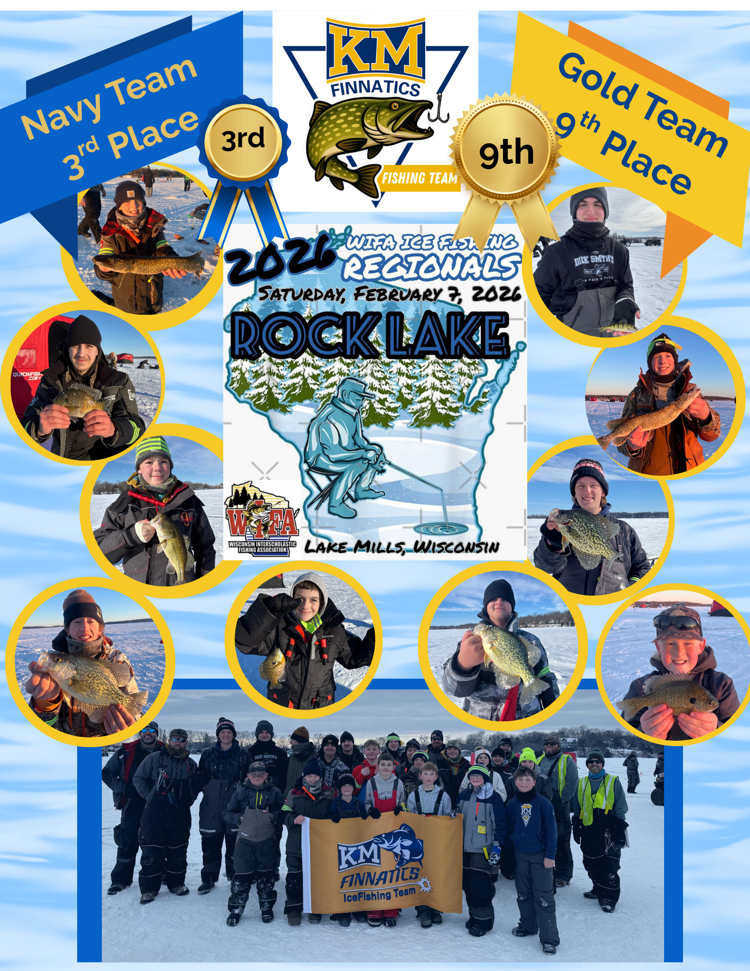 The KM Finnatics Fishing Team participated in the Wisconsin Interscholastic Fishing Association (WIFA) Regionals Tournament on February 7 at Rock Lake in Lake Mills. There were 13 schools in attendance with 25 teams of 12 anglers fishing. We are very proud that our Kettle Moraine Navy team finished in 3rd place and our Kettle Moraine Gold Team finished in 9th place! Top schools are determined by total inches of specific species of fish caught during a designated time period. We qualified to send the Finnatics team to fish in the WIFA State Tournament in Wausau this weekend where 92 teams will be competing for the top spot! Good Luck, Anglers!