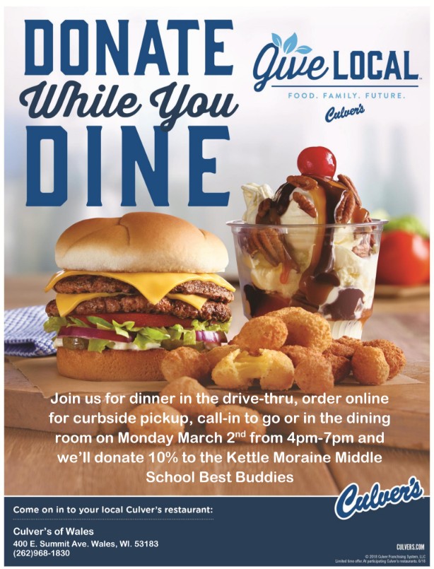 Culver’s will generously donate 10% to the KMMS Best Buddies program when you purchase food on Monday, March 2nd from 4pm - 7pm. |