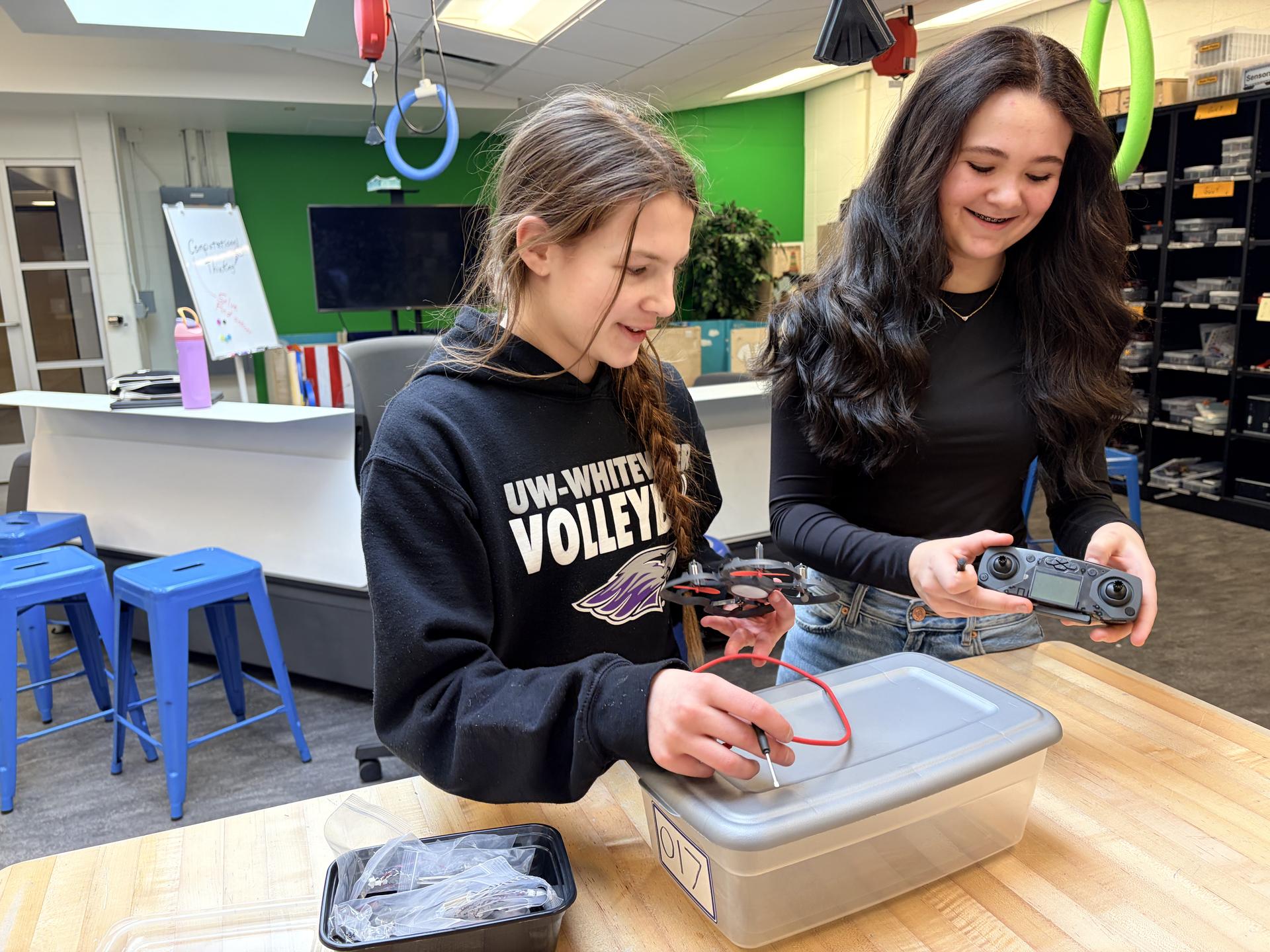 Featured below are Kellen K and Gavin M putting computers back together after 8th graders disassembled them to learn about different parts. Also featured is Adrianna S & Ali W who spend time soldering DC motors from the Arduino unit of study and fixing drones. Huge thanks to these students for their commitment to the computer science program |