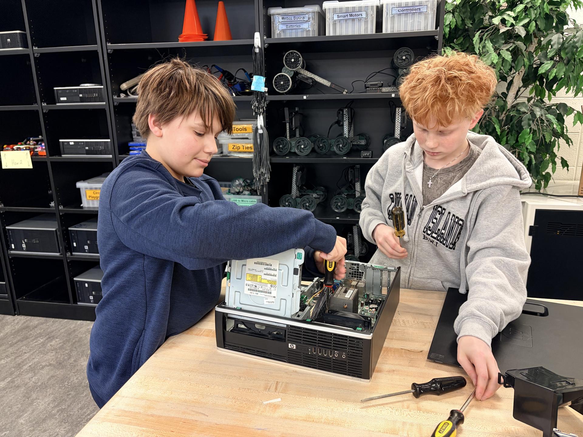 The Computer Science programs in grades 6, 7 and 8 drive student engagement by providing a curriculum that is more and more hands-on. This requires a great deal of equipment that students can program or take apart in a manner similar to what is done in future careers. This article features students that take time out of their day to help either fix components or put computers back together. Without their help, the program would be incredibly time demanding or equipment might not be available for student work..