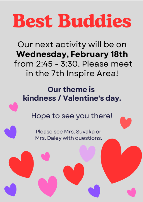 The next Best Buddies event is Wednesday, February 18th from 2:45 - 3:30. We will meet in the 7th Grade Inspire Open Area. Reach out to Mrs. Suvaka or Mrs. Daley with any questions! We hope to see you there! |
