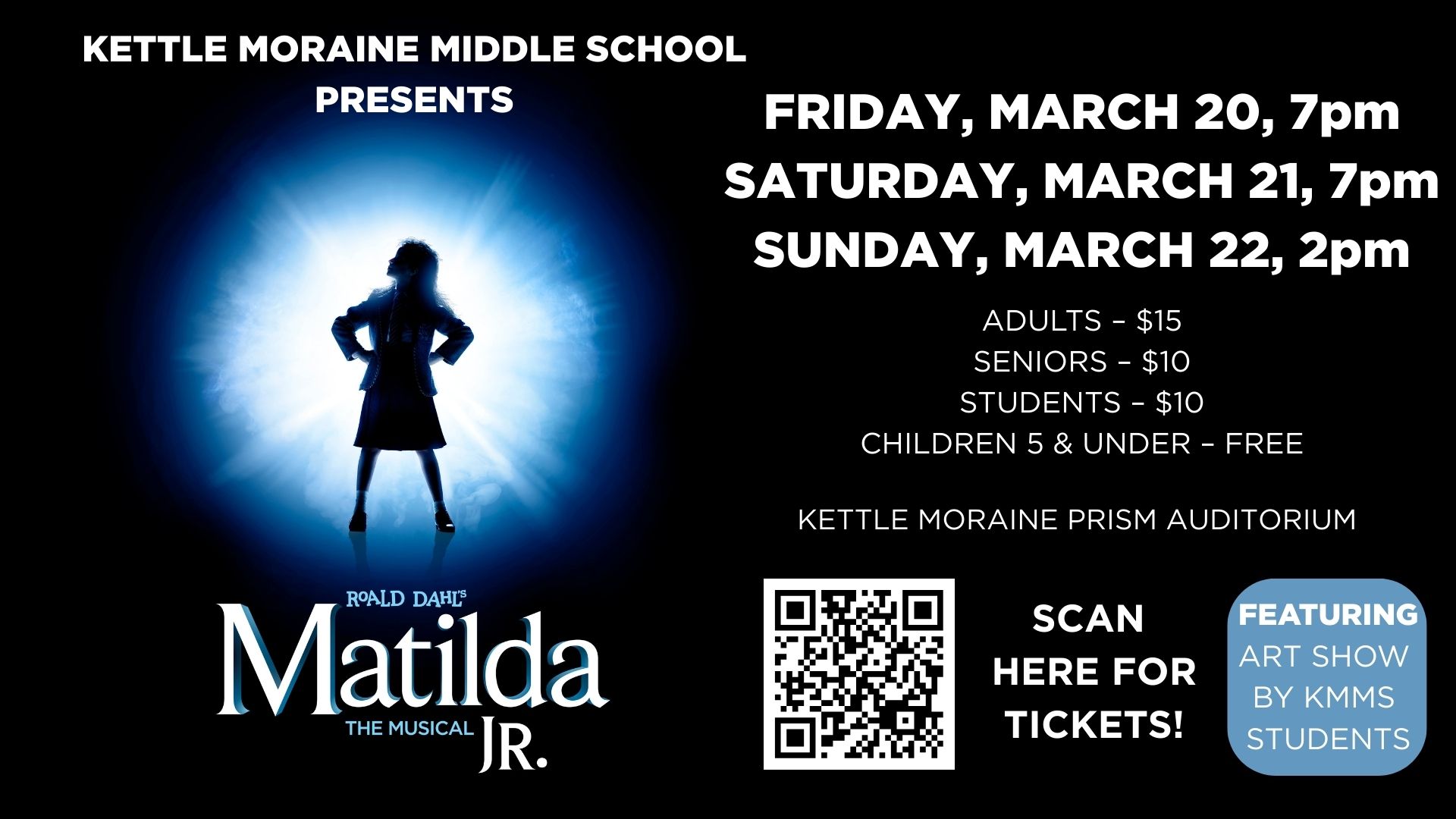 Kettle Moraine Middle School presents Matilda Jr. on March 20 and 21 at 7pm and March 22 at 2pm at the Kettle Moraine Prism Auditorium. There will also be an art show by KMMS students in the auditorium lobby.
