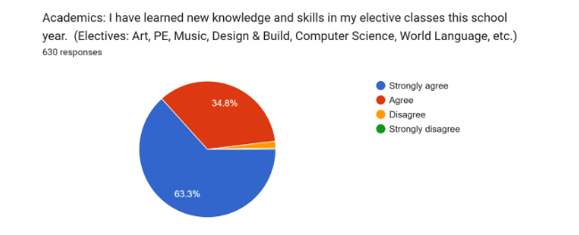 By the way, our students rated our elective classes as a very positive part of their experience at KMMS. We had 630 students take a survey in January, and 98.1% agreed or strongly agreed that they were learning new knowledge and skills in their elective classes. Overall, the students surveyed rated their educational growth very positively, with 94.% of students who agreed or strongly agreed they were growing as a reader and 96.5% who said they were learning and improving their math skills this school year.